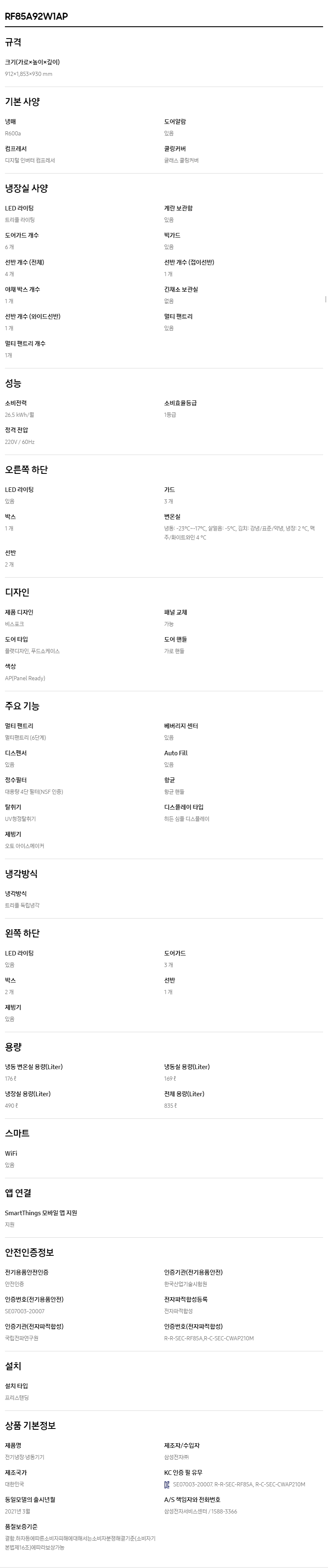 삼성 비스포크 냉장고 4도어 프리스탠딩 코타화이트 835L