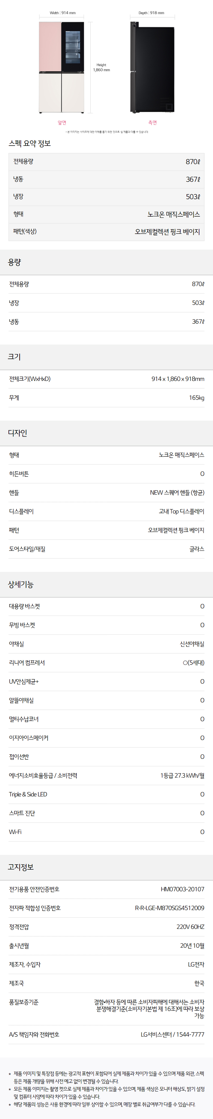 LG 디오스 노크온 오브제컬렉션 양문형냉장고 핑크베이지 870L