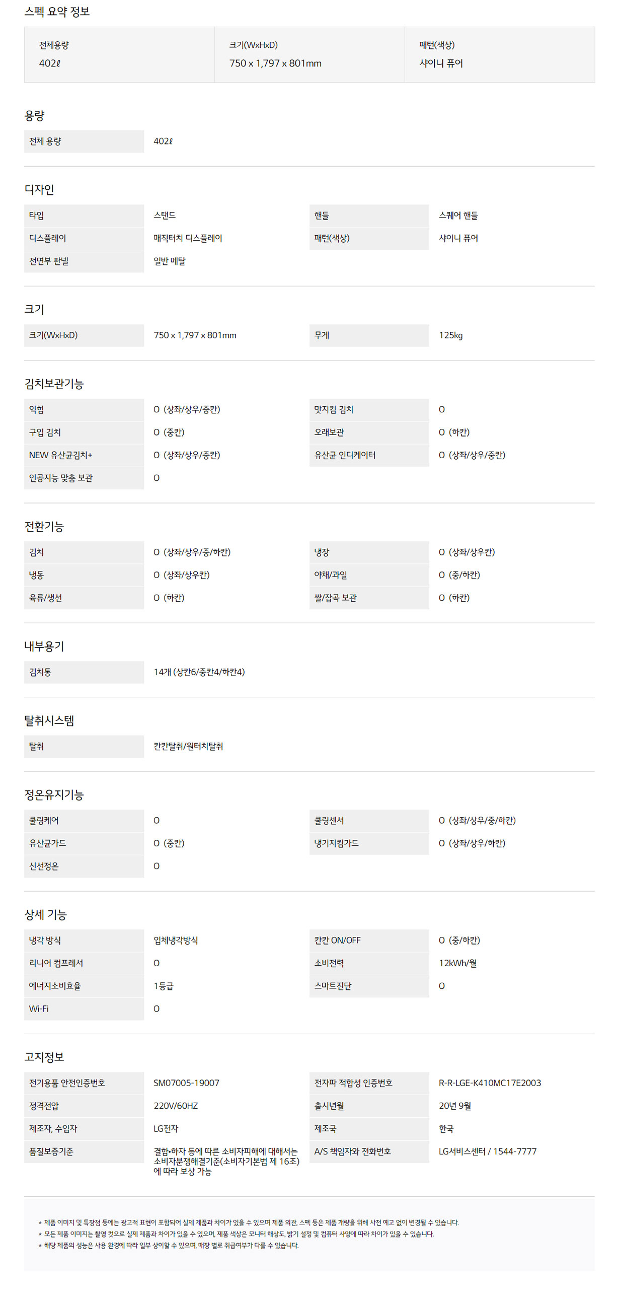 K410SS19E 스마트렌탈 [LG] 디오스 김치톡톡 스탠드형 김치냉장고 402L 샤이니퓨어 제품분류 김치냉장고 용량(총량) 400L이상 기능 4도어 AS기간 1년 최저 렌탈가 월 59,000 (렌탈가) 60개월 48개월 36개월 할인 제휴카드 보기 렌탈신청 장바구니