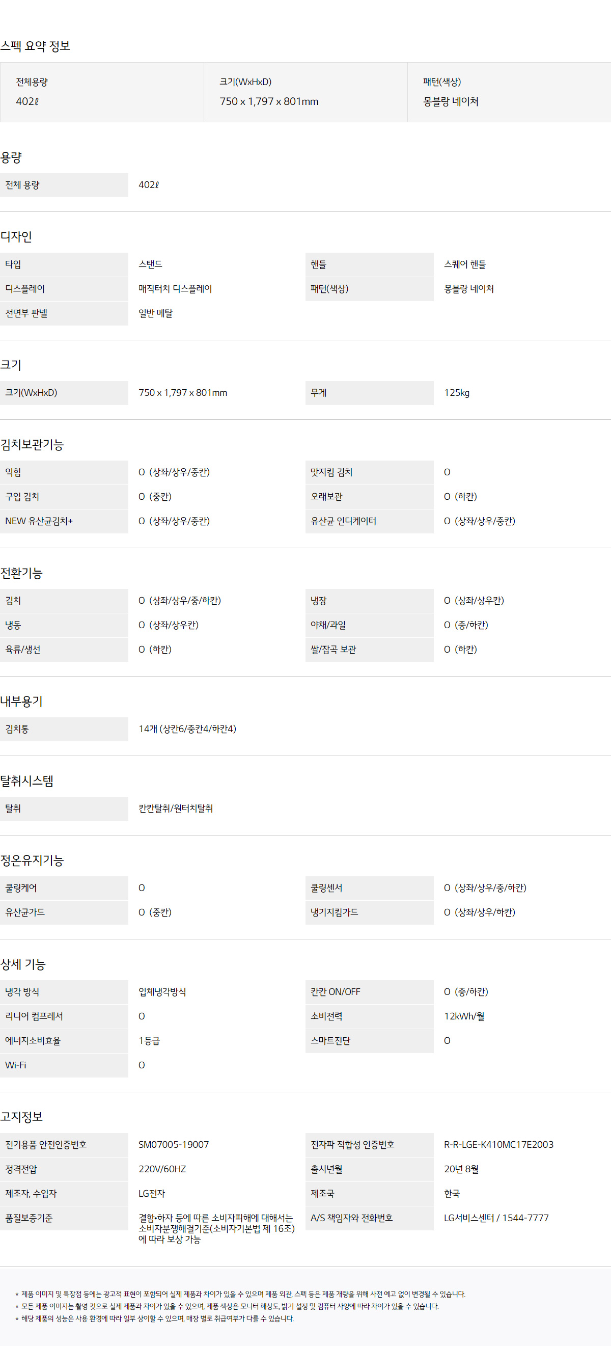 K410MB19E CS렌탈 [LG] 디오스 김치톡톡 스탠드형 402L 몽블랑 네이처 제품분류 김치냉장고 용량(총량) 400L이상 기능 4도어 AS기간 3년 최저 렌탈가 월 73,000 (렌탈가) 48개월 36개월 할인 제휴카드 보기 렌탈신청 장바구니