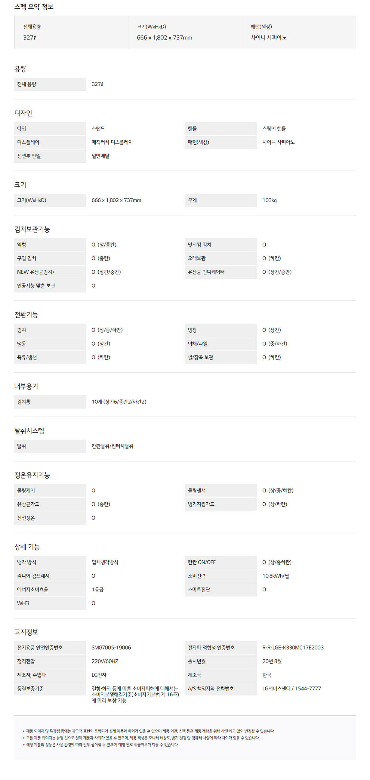K330SN19E CS렌탈 [LG] DIOS 김치톡톡 스탠드형 327L 샤이니 사피아노 제품분류 김치냉장고 용량(총량) 300L이상 기능 3도어 AS기간 3년 최저 렌탈가 월 53,500 (렌탈가) 48개월 36개월 할인 제휴카드 보기 렌탈신청 장바구니