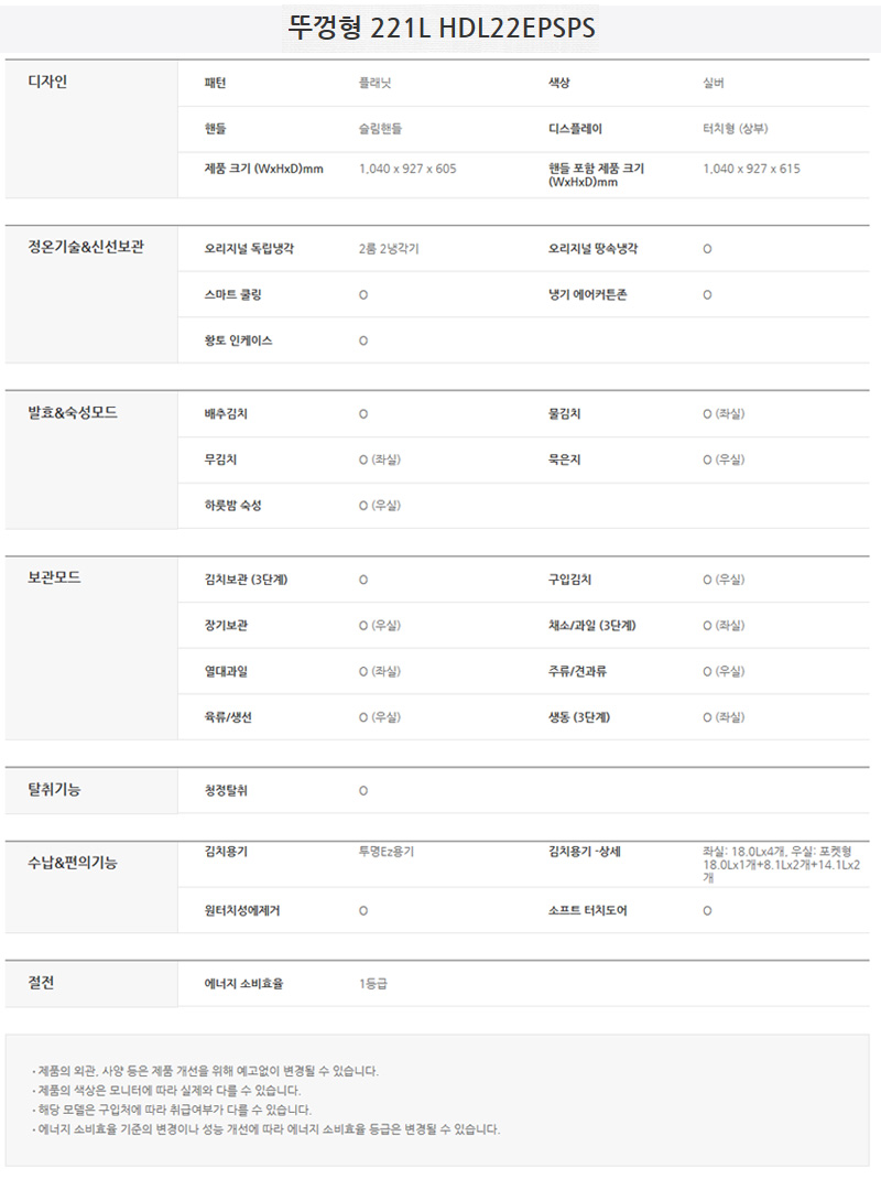 HDL22EPSPS_AT 스마트렌탈 [위니아] 딤채 뚜껑형 김치냉장고 221L 플래닛 실버 제품분류 김치냉장고 용량(총량) 200L이상 기능 뚜껑형 AS기간 1년 최저 렌탈가 월 27,500 (렌탈가) 60개월 48개월 36개월 할인 제휴카드 보기 렌탈신청 장바구니