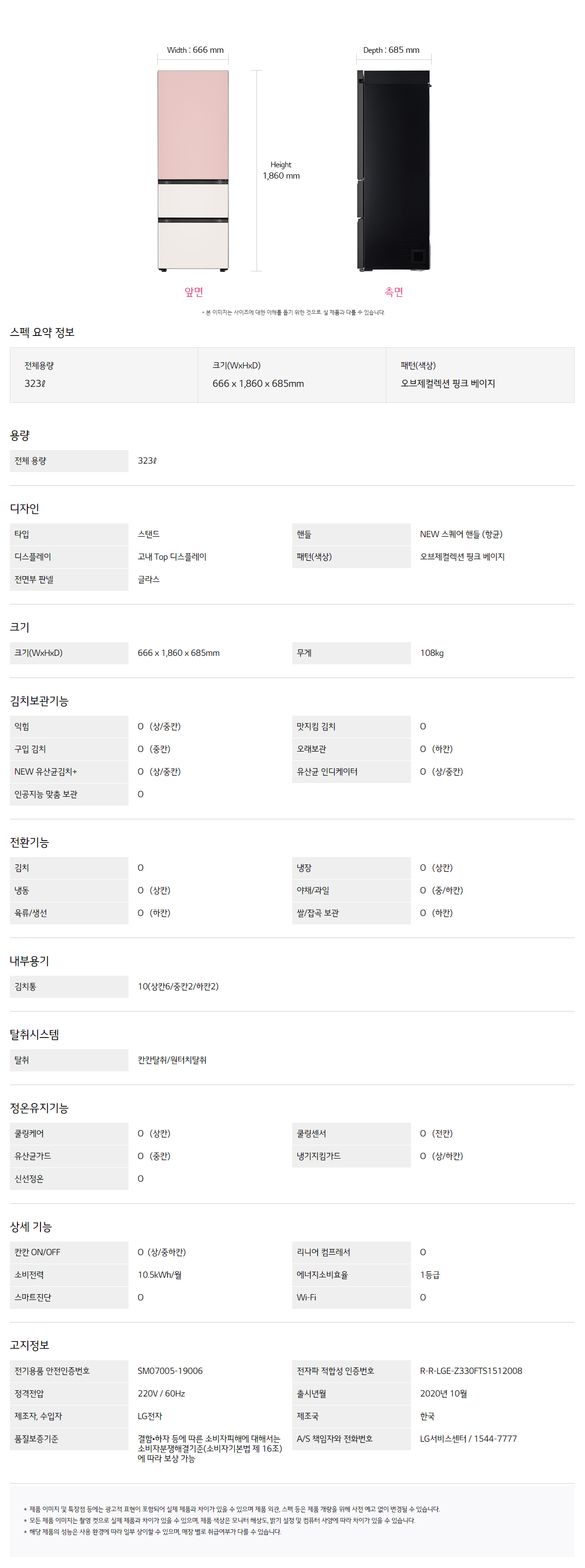 Z330GPB151 CS렌탈 [LG] 오브제컬렉션 김치냉장고 323L 핑크 베이지 제품분류 김치냉장고 용량(총량) 300L이상 기능 3도어 AS기간 3년 최저 렌탈가 월 73,000 (렌탈가) 48개월 36개월 할인 제휴카드 보기 렌탈신청 장바구니