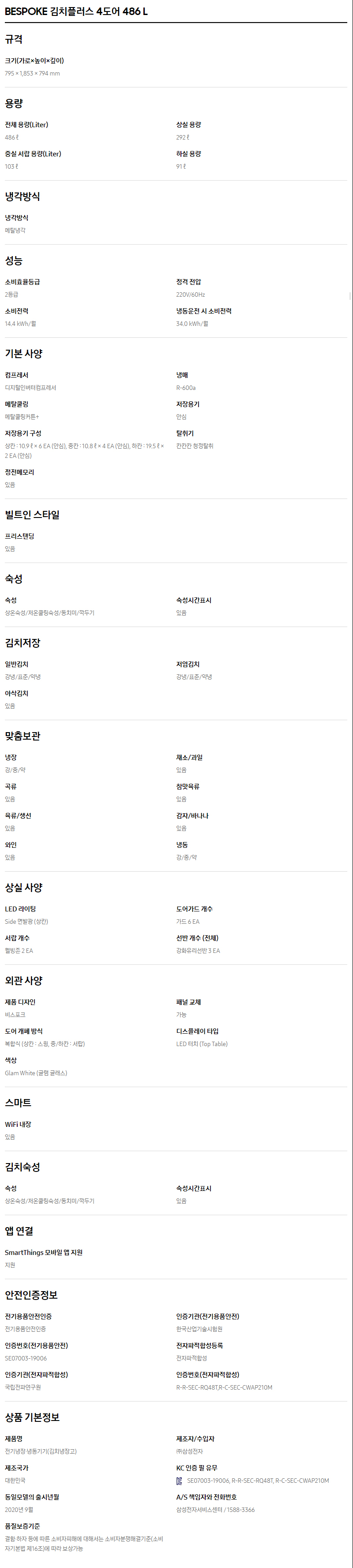 RQ48T94B235 CS렌탈 [삼성] BESPOKE 김치플러스 4도어 486L 글램 화이트 제품분류 김치냉장고 용량(총량) 400L이상 기능 4도어 AS기간 3년 최저 렌탈가 월 58,000 (렌탈가) 60개월 48개월 36개월 할인 제휴카드 보기 렌탈신청 장바구니