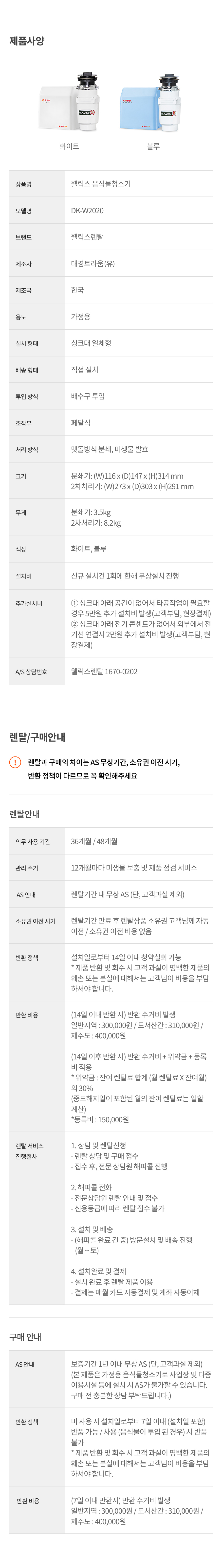 DK-W2020 웰릭스 웰릭스 음식물청소기 제품분류 음식물처리기 색상 화이트,블루 AS기간 렌탈기간내 최저 렌탈가 월 29,900 (렌탈가) 제휴카드 할인가 월 (렌탈가) 48개월 36개월 화이트 블루 할인 제휴카드 보기 렌탈신청 장바구니