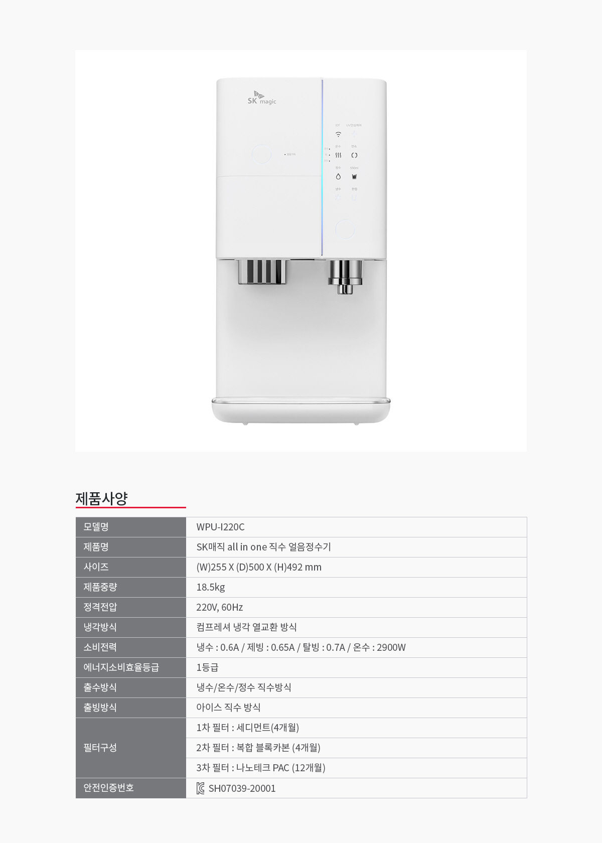 WPU-I220C 에스케이 직수냉온얼음정수기(5년15%할인) 제품분류 정수기 정수방식 직수형 기능 얼음냉온 AS기간 렌탈기간내 최저 렌탈가 월 39,010 (렌탈가) 제휴카드 할인가 월 (렌탈가) 3년 4년 5년 할인 제휴카드 보기 렌탈신청 장바구니