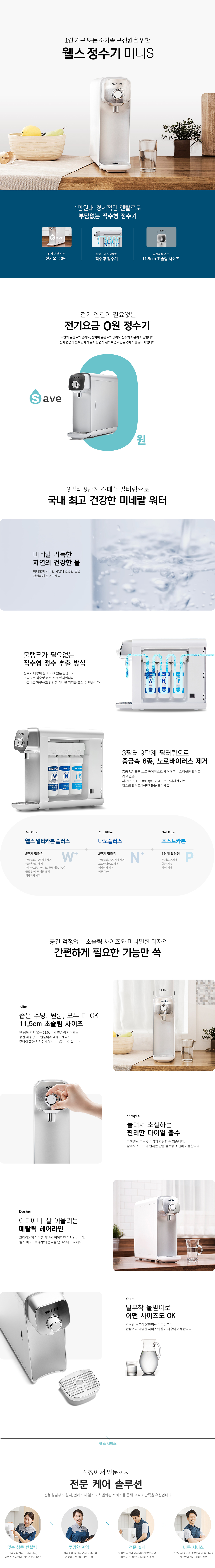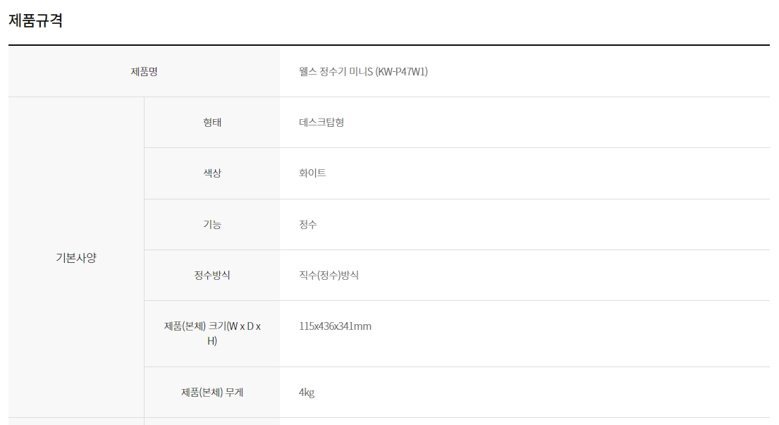 KW-P47F1 교원웰스 웰스 정수기 미니S (셀프관리) 제품분류 정수기 정수방식 직수형 기능 정수전용 AS기간 렌탈기간내 최저 렌탈가 월 9,900 (렌탈가) 5년 3년 2년 프로모션 보상할인 정상 할인 제휴카드 보기 렌탈신청 장바구니