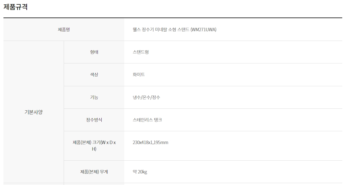 WM271 교원웰스 웰스 정수기 미네랄 소형 스탠드 제품분류 정수기 정수방식 탱크형 기능 냉온정 AS기간 렌탈기간내 최저 렌탈가 월 26,900 (렌탈가) 3년 보상할인 정상 할인 제휴카드 보기 렌탈신청 장바구니