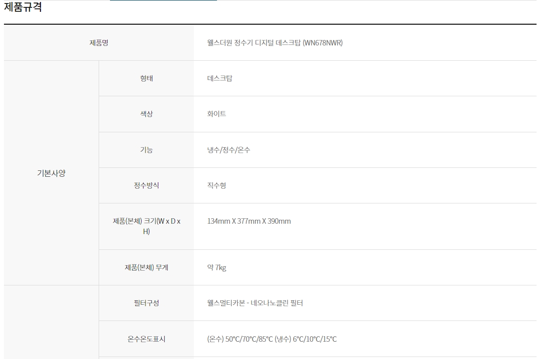 WN678NWR 교원웰스 웰스 더원 정수기 디지털 데스크탑 화이트 (셀프관리,10%할인) 제품분류 정수기 정수방식 직수형 기능 냉온정 AS기간 렌탈기간내 최저 렌탈가 월 25,110 (렌탈가) 6년 3년 보상할인 정상 할인 제휴카드 보기 렌탈신청 장바구니