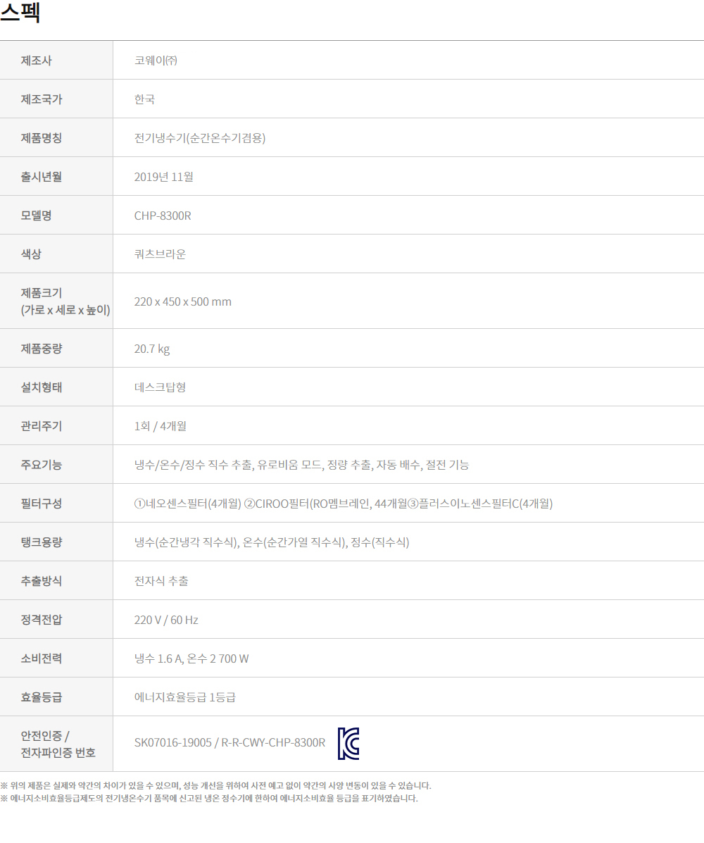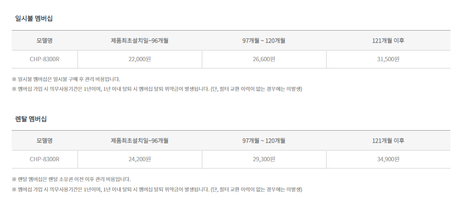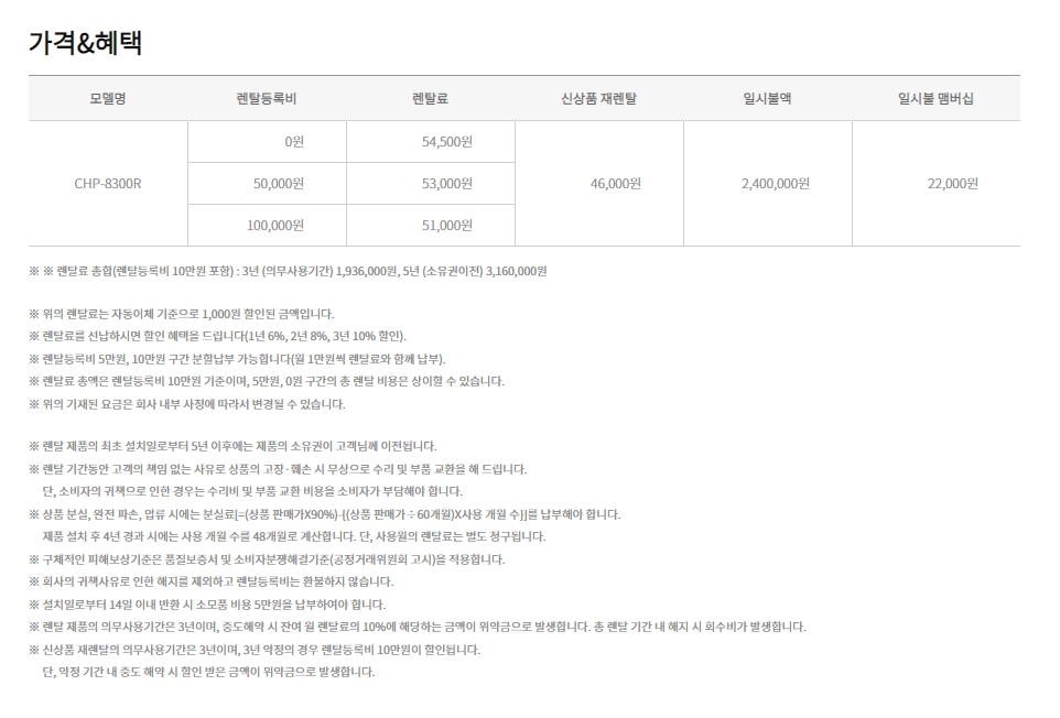 CHP-8300R 코웨이 코웨이 한뼘 시루직수 정수기(냉온정) 제품분류 정수기 정수방식 직수형 기능 냉온정 AS기간 렌탈기간내 최저 렌탈가 월 37,900 (렌탈가) 3년 할인 제휴카드 보기 렌탈신청 장바구니