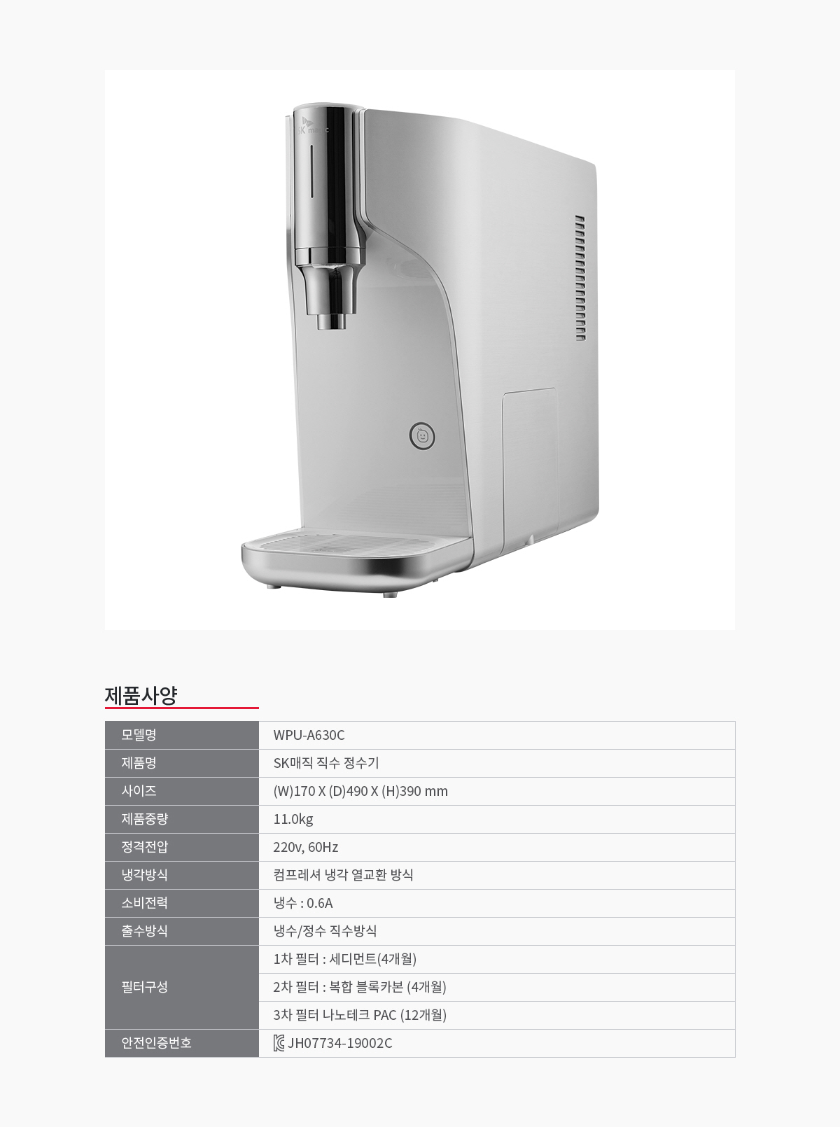 WPU-A630C 에스케이 직수올인원냉정수기 제품분류 정수기 정수방식 직수형 기능 냉수전용 AS기간 렌탈기간내 최저 렌탈가 월 28,900 (렌탈가) 제휴카드 할인가 월 (렌탈가) 3년 4년 5년 할인 제휴카드 보기 렌탈신청 장바구니
