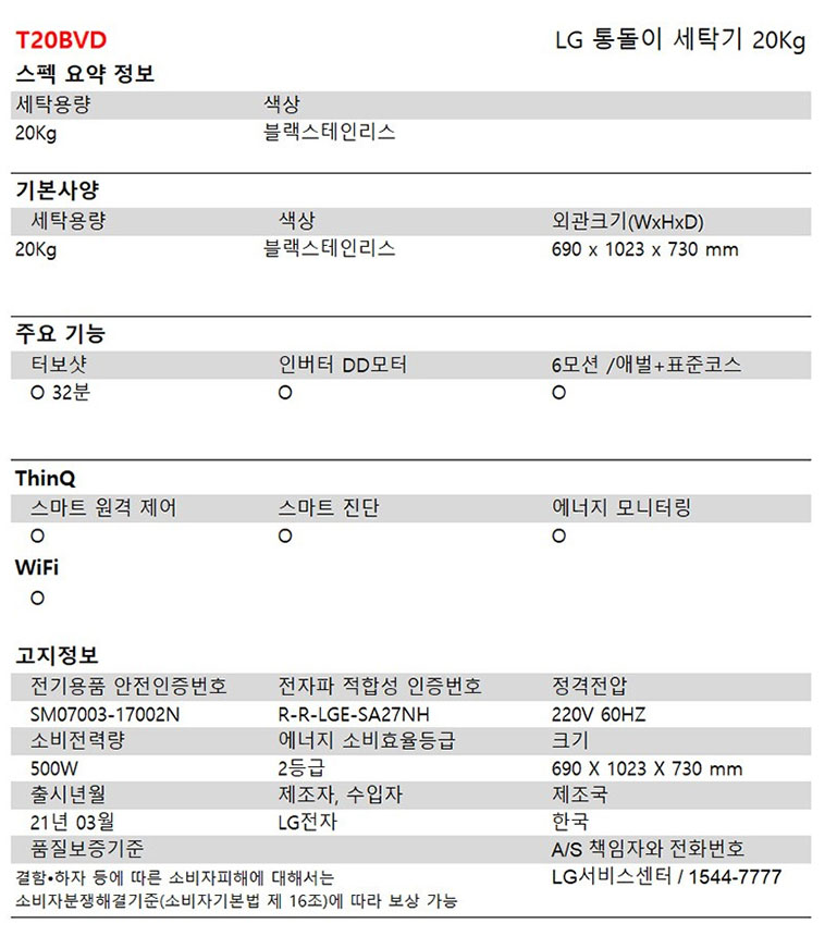 [LG] 통돌이 세탁기 20KG 블랙 스테인리스