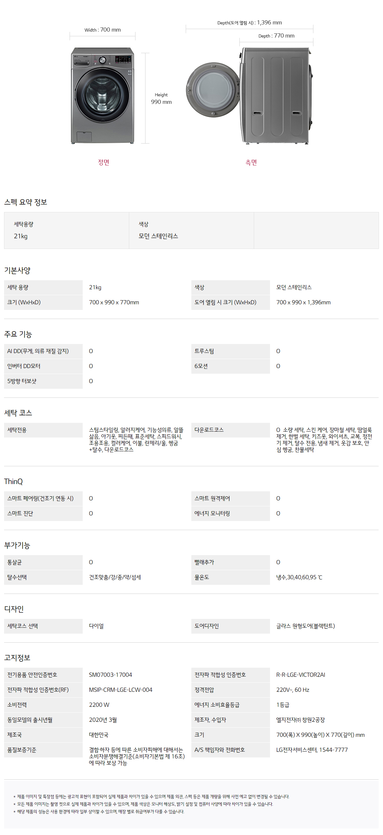 F21VDD 스마트렌탈 [LG] 트롬 ThinQ 세탁기 21kg 모던 스테인리스 제품분류 세탁기 용량(총량) 21KG AS기간 1년 최저 렌탈가 월 43,500 (렌탈가) 60개월 48개월 36개월 할인 제휴카드 보기 렌탈신청 장바구니