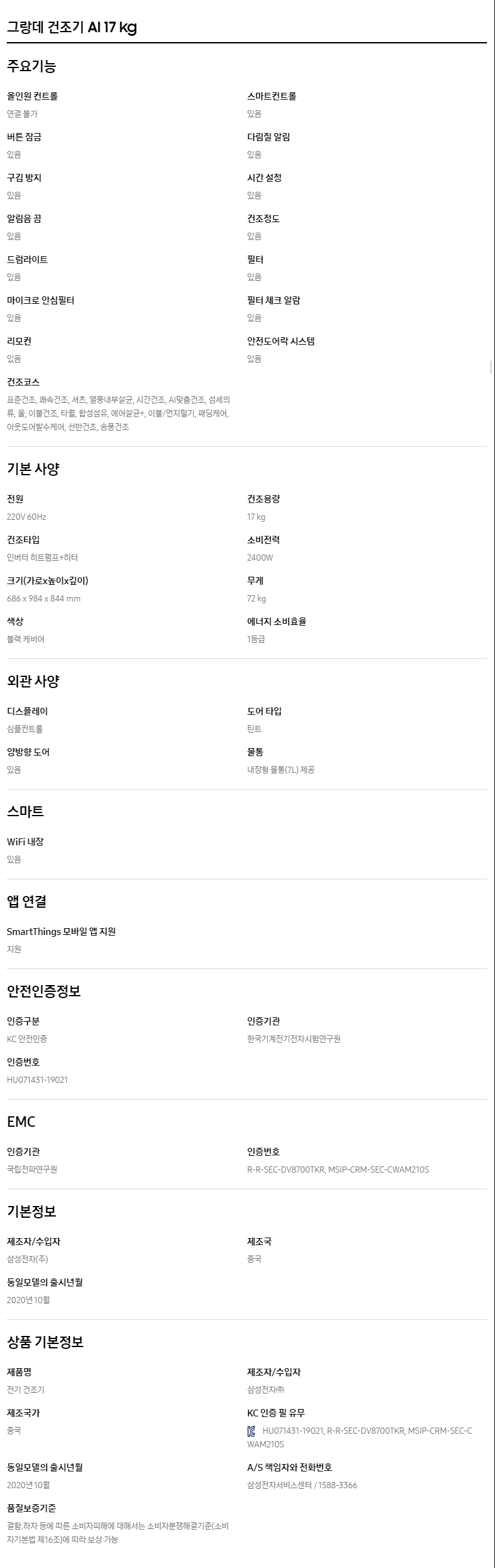 삼성 그랑데 건조기 AI 블랙케비어 17kg