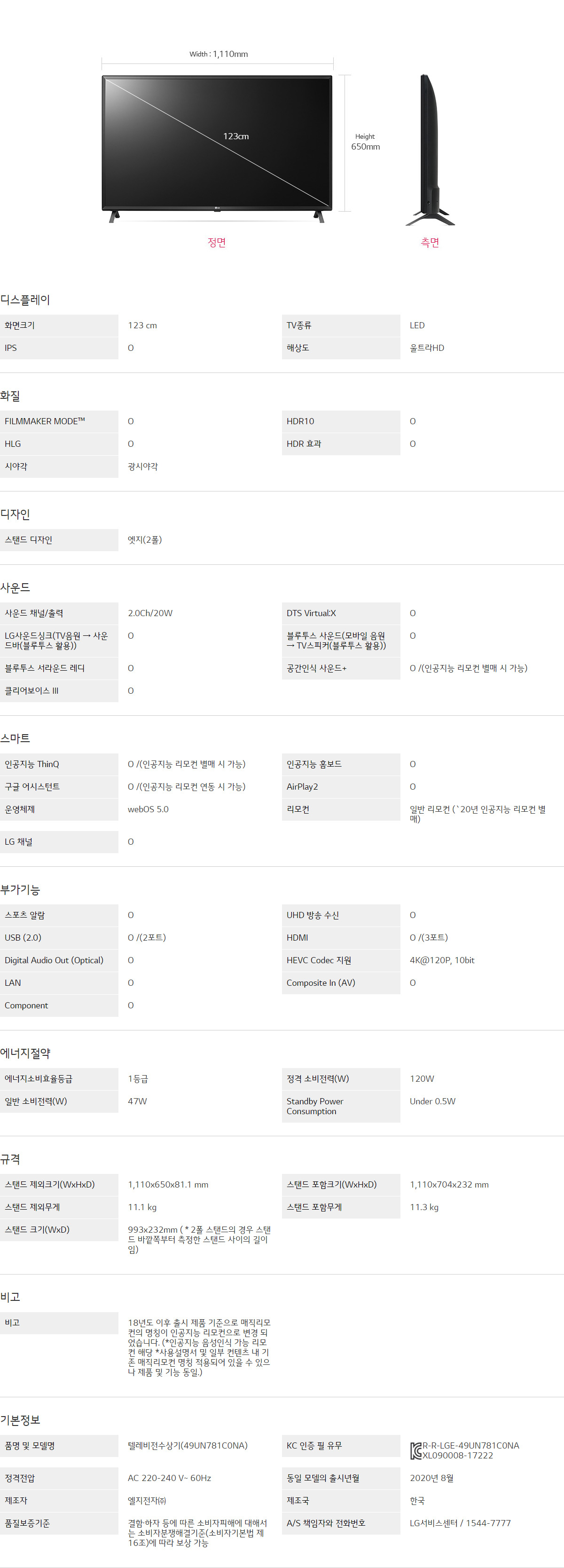 49UN781C 딜라이브 엘지 UHD 49인치 제품분류 TV 제품규격 49인치 AS기간 1년 최저 렌탈가 월 19,200 (렌탈가) 60개월 48개월 36개월 스탠드 벽걸이 할인 제휴카드 보기 렌탈신청 장바구니