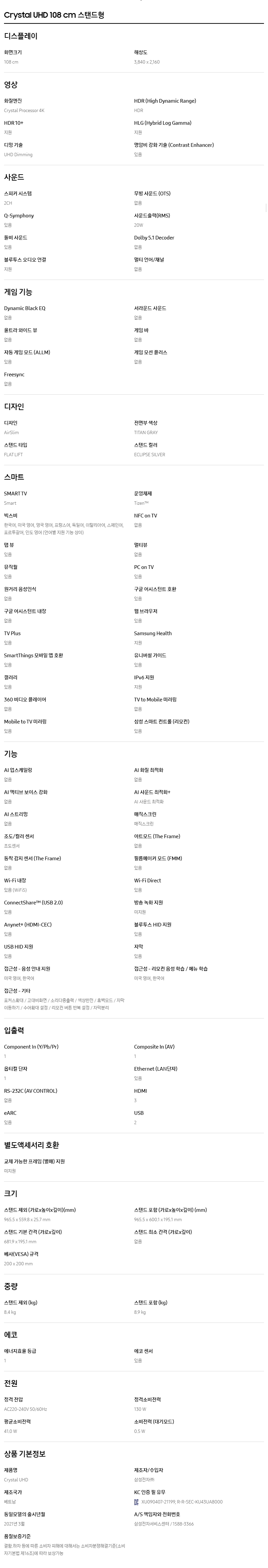 KU43UA8000FXKR_ST,KU43UA8000FXKR_WA 스마트렌탈 [삼성] 크리스탈 UHD TV 43인치 제품분류 TV 제품규격 43인치 AS기간 3년 최저 렌탈가 월 23,500 (렌탈가) 60개월 48개월 36개월 스탠드 벽걸이 할인 제휴카드 보기 렌탈신청 장바구니