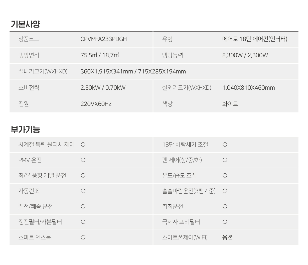 CPVM-A233PDGH_a 스마트렌탈 [캐리어] 에어로 스탠다드형 에어컨 23평형+6평형 제품분류 에어컨 AS기간 2년 최저 렌탈가 월 49,900 (렌탈가) 60개월 48개월 36개월 할인 제휴카드 보기 렌탈신청 장바구니