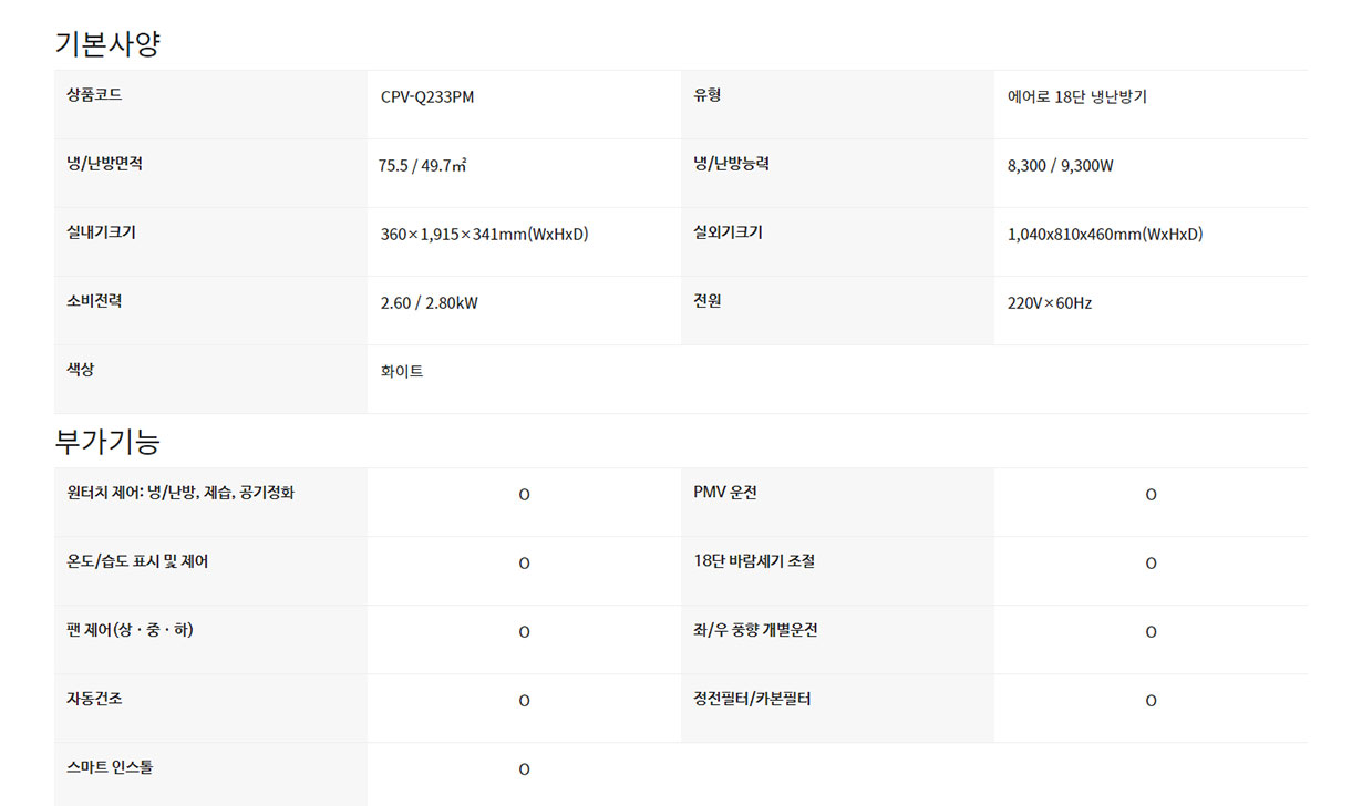 CPV-Q233PM CS렌탈 [캐리어] 에어로 18단 냉난방기 23평 제품분류 냉난방기 AS기간 3년 최저 렌탈가 월 50,100 (렌탈가) 60개월 48개월 36개월 할인 제휴카드 보기 렌탈신청 장바구니