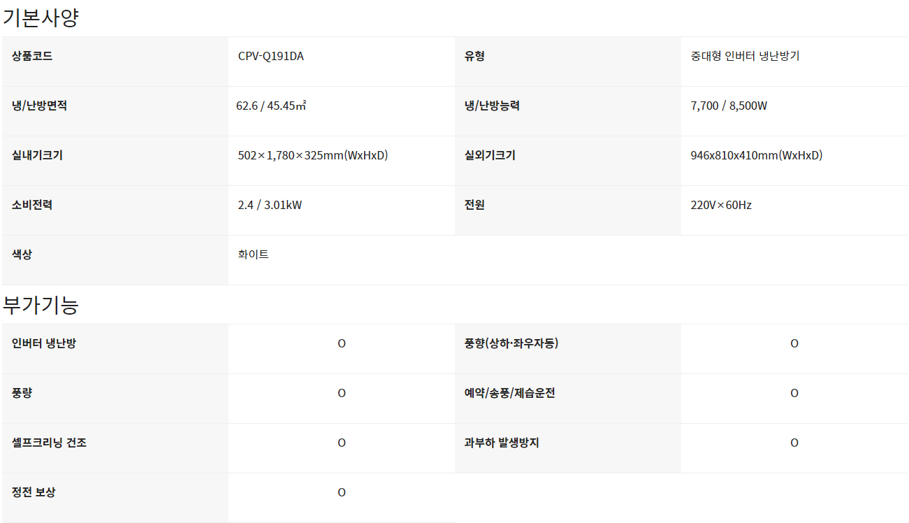 CPV-Q191DA CS렌탈 [캐리어] 인버터 냉난방기 19평형(단상) 제품분류 냉난방기 AS기간 3년 최저 렌탈가 월 43,500 (렌탈가) 60개월 48개월 36개월 할인 제휴카드 보기 렌탈신청 장바구니