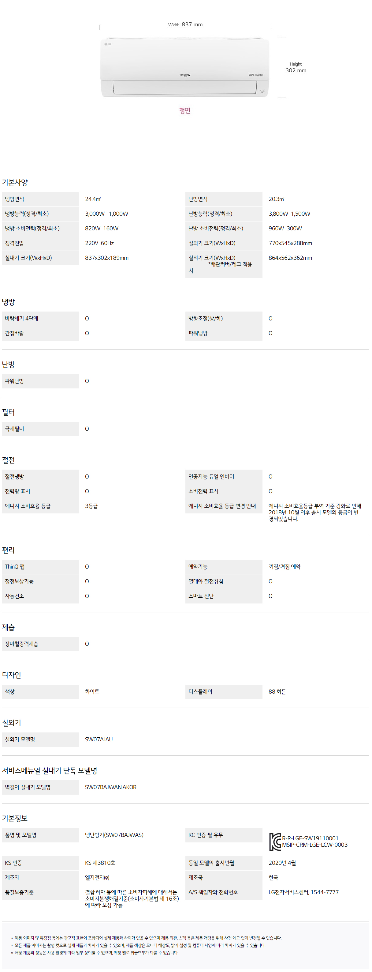 SW07BAJWAS CS렌탈 [LG] 휘센 냉난방 에어컨 벽걸이형 7평형 제품분류 냉난방기 AS기간 3년 최저 렌탈가 월 28,000 (렌탈가) 60개월 48개월 36개월 할인 제휴카드 보기 렌탈신청 장바구니