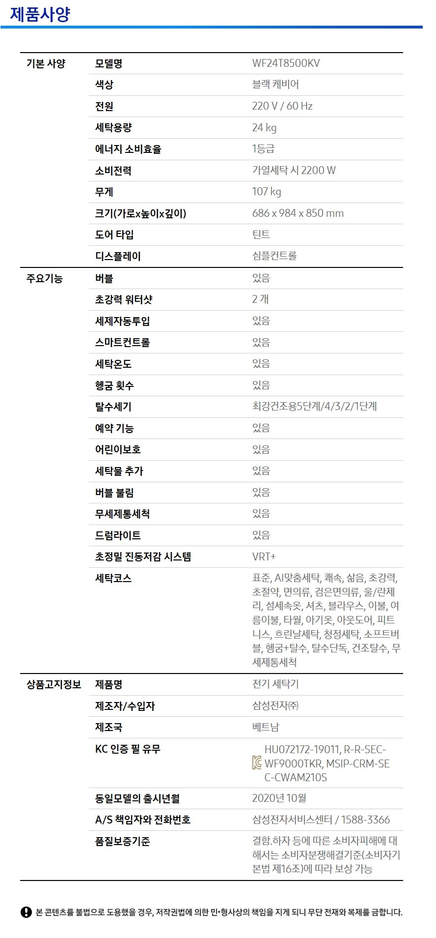 WF24T8500KV 스마트렌탈 [삼성] 그랑데 AI 세탁기 24kg 블랙 케비어 제품분류 세탁기 용량(총량) 24KG AS기간 3년 최저 렌탈가 월 37,000 (렌탈가) 60개월 48개월 36개월 할인 제휴카드 보기 렌탈신청 장바구니