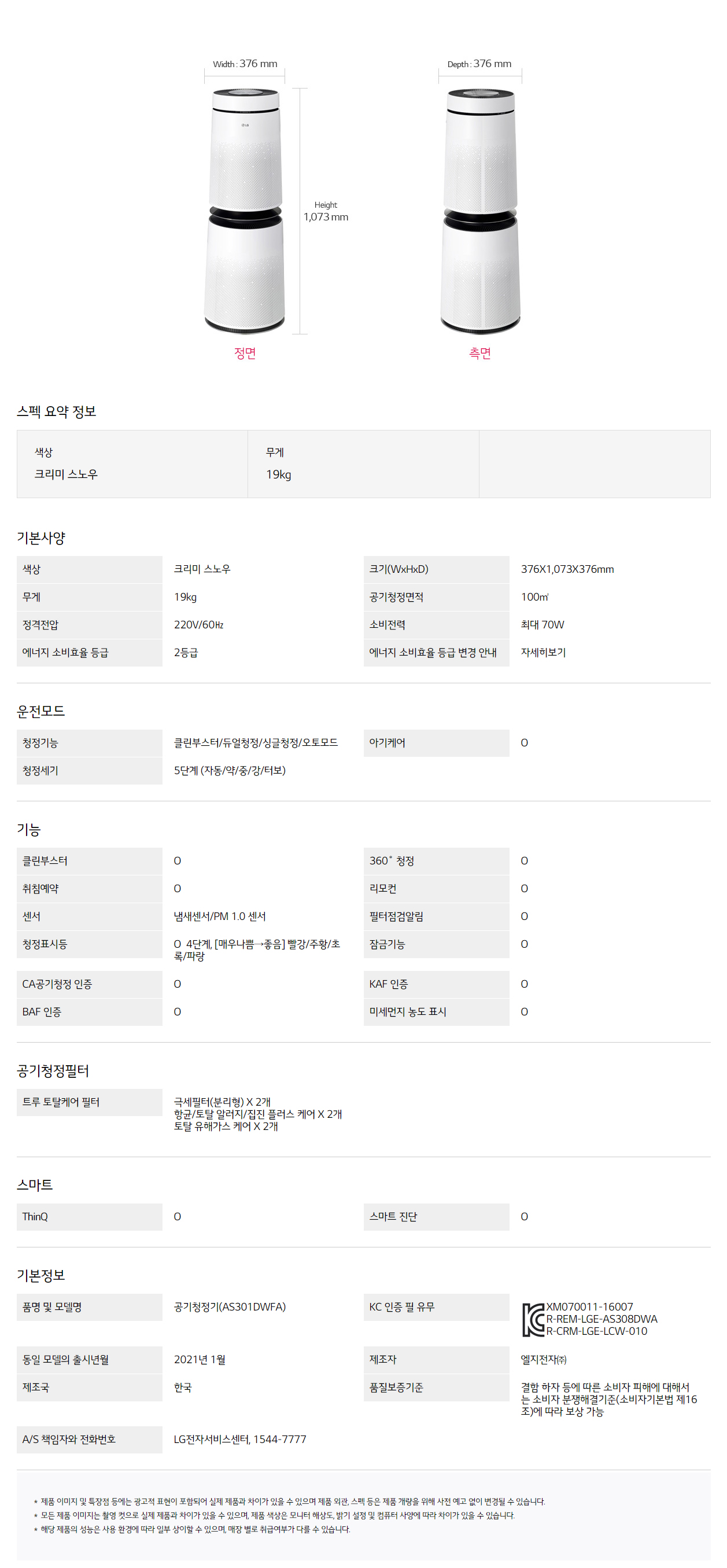AS301DWFA CS렌탈 [LG] 퓨리케어 360도 공기청정기 플러스 30평형 크리미스노우 제품분류 청정기 AS기간 3년 최저 렌탈가 월 38,500 (렌탈가) 48개월 36개월 할인 제휴카드 보기 렌탈신청 장바구니