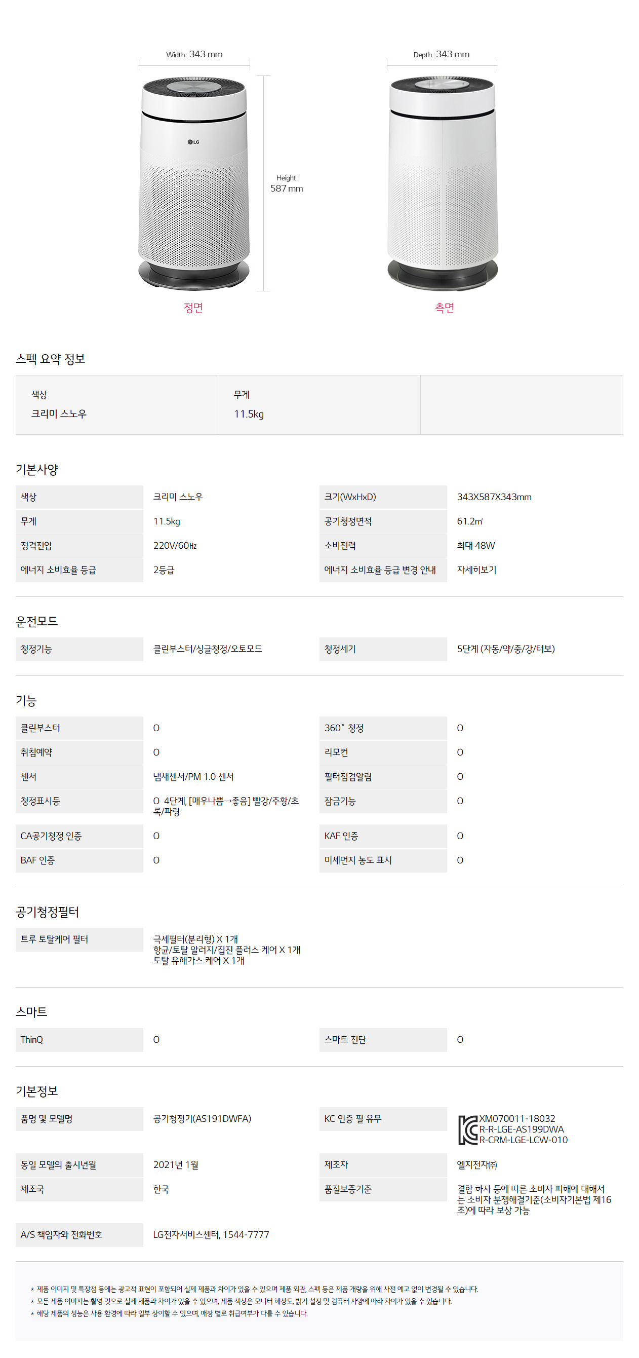 [LG] 퓨리케어 360도 공기청정기 플러스 19평형 크리미스노우