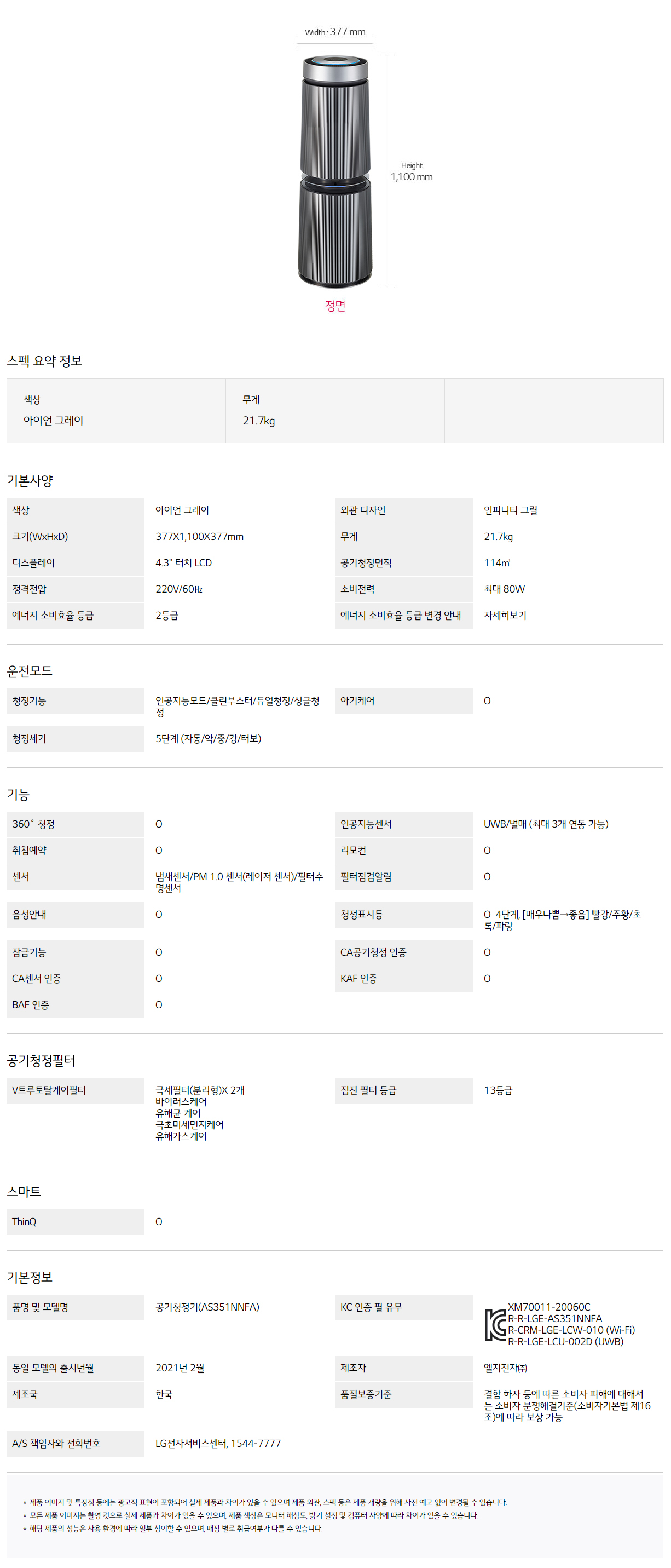 AS351NNFA CS렌탈 [LG] 퓨리케어 360 공기청정기 알파 35평형 아이언 그레이 제품분류 청정기 AS기간 3년 최저 렌탈가 월 59,400 (렌탈가) 48개월 36개월 할인 제휴카드 보기 렌탈신청 장바구니
