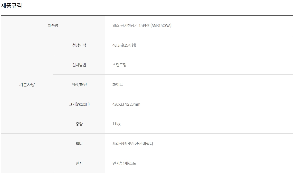 AM315 교원웰스 웰스 공기청정기 15평형(방문관리) 제품분류 청정기 AS기간 렌탈기간내 최저 렌탈가 월 33,900 (렌탈가) 3년 보상할인 정상 할인 제휴카드 보기 렌탈신청 장바구니