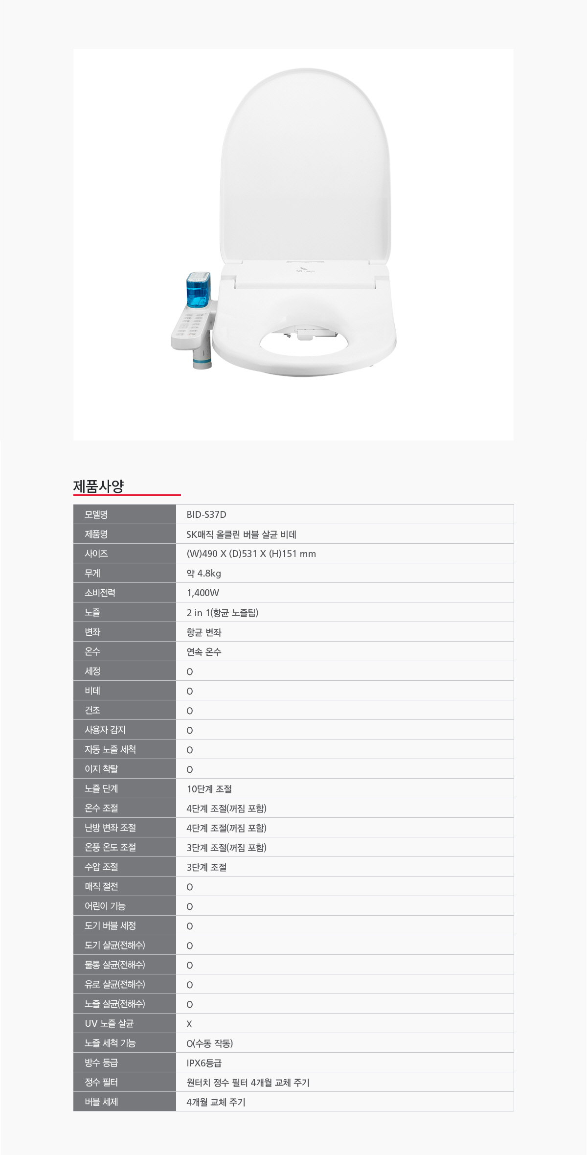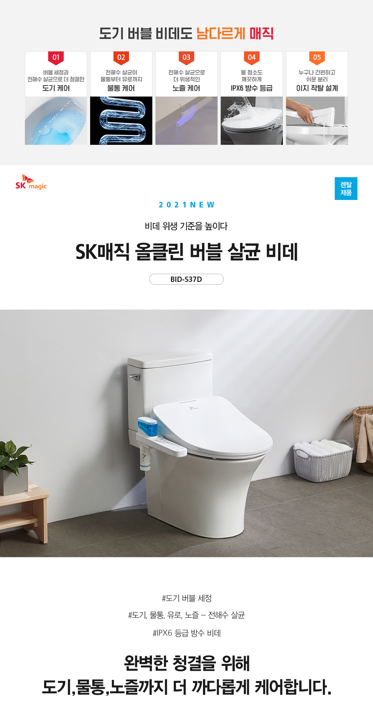 BID-S37D 에스케이 올클린 버블 살균 비데_IPX6등급 방수 (전해수 ALL살균) 제품분류 비데 AS기간 1년 최저 렌탈가 월 21,900 (렌탈가) 제휴카드 할인가 월 (렌탈가) 5년 4년 3년 할인 제휴카드 보기 렌탈신청 장바구니