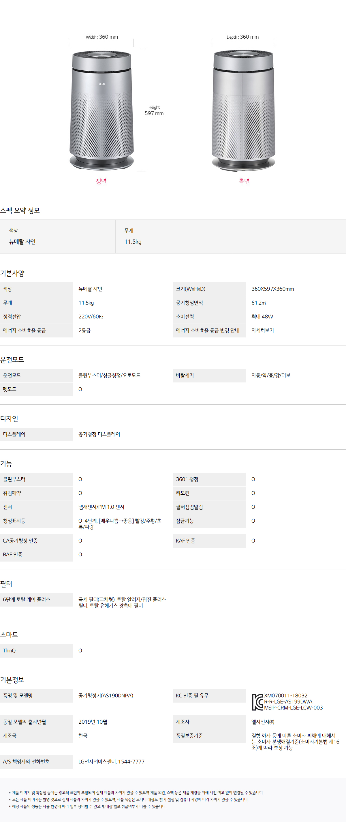 AS191DNPA 스마트렌탈 [LG] 퓨리케어 360도 펫 공기청정기 19평형 뉴메탈샤인 제품분류 청정기 기능 펫기능 AS기간 1년 최저 렌탈가 월 27,000 (렌탈가) 60개월 48개월 36개월 할인 제휴카드 보기 렌탈신청 장바구니