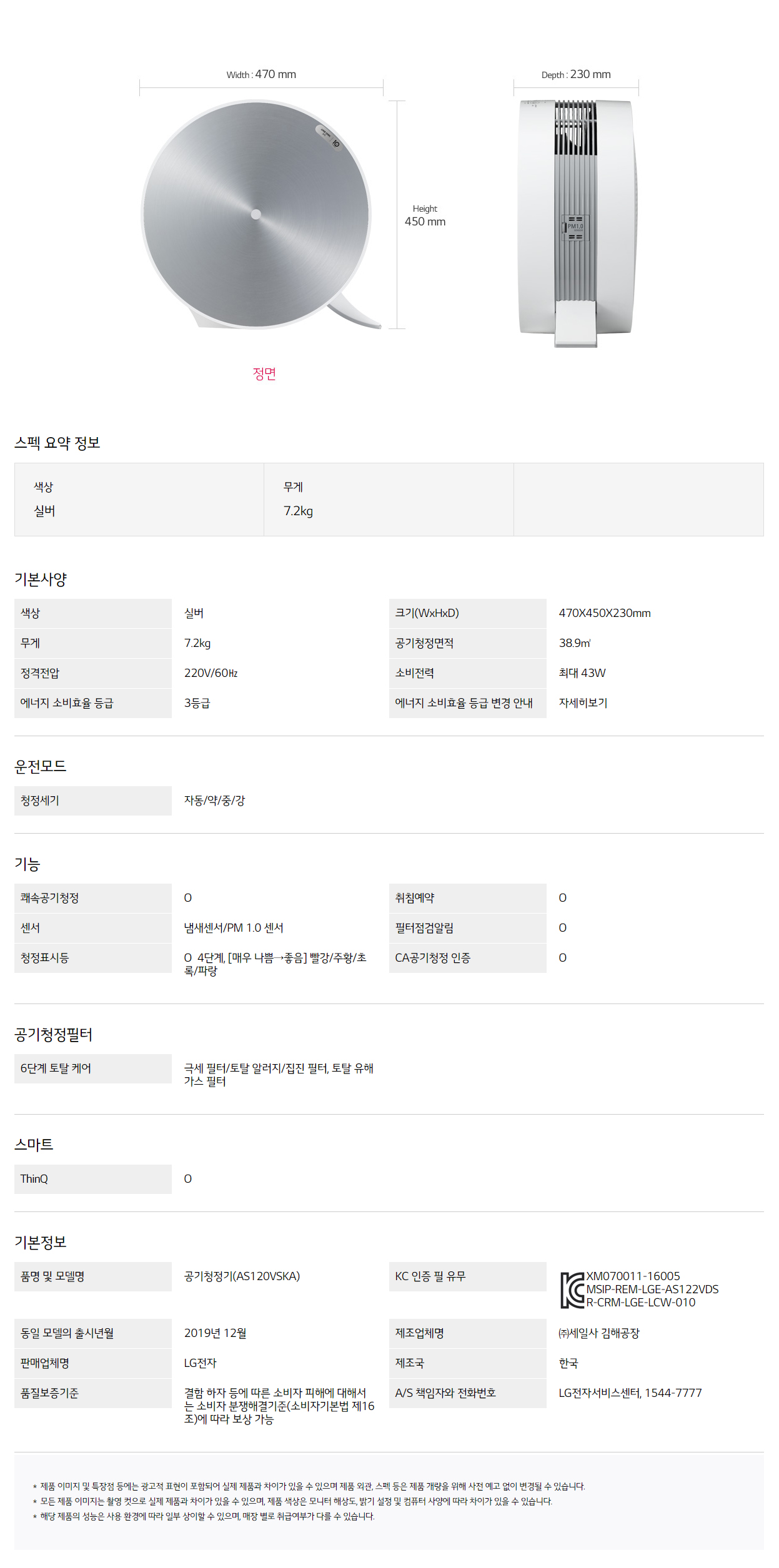 AS120VSKA CS렌탈 [LG] 퓨리케어 공기청정기 12평형 실버 제품분류 청정기 AS기간 3년 최저 렌탈가 월 9,500 (렌탈가) 48개월 36개월 할인 제휴카드 보기 렌탈신청 장바구니