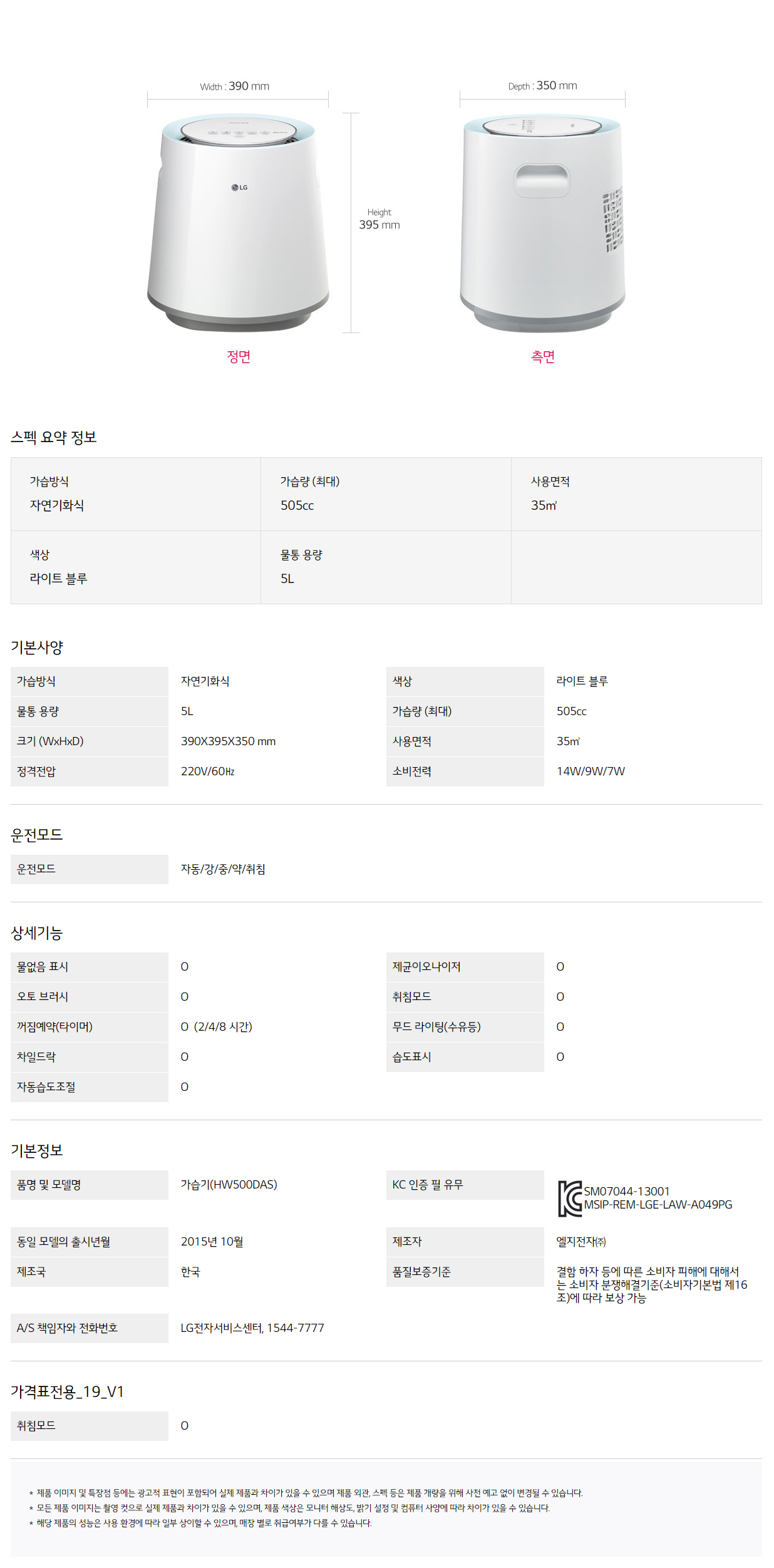 HW500DAS CS렌탈 [LG] 퓨리케어 자연기화 가습기 5L 제품분류 청정기 기능 가습기능 AS기간 3년 최저 렌탈가 월 12,600 (렌탈가) 48개월 36개월 할인 제휴카드 보기 렌탈신청 장바구니